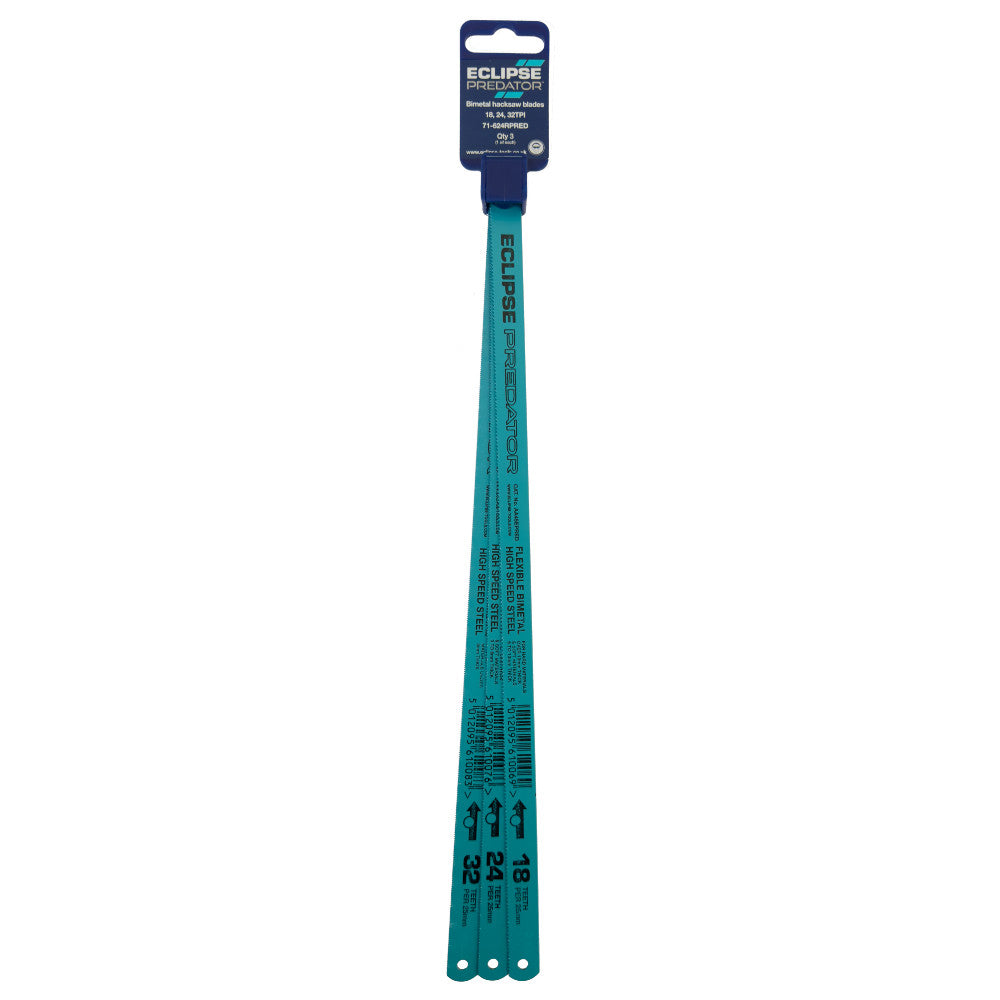 Upgrade your cutting precision with the ECLIPSE 3 Piece Bi-Metal Hacksaw Blade Pack—engineered for durability, flexibility, and clean cuts through metal, plastic, and wood. These high-performance hacksaw blades are a must-have for professionals and DIYers seeking reliable, long-lasting blades that won’t snap under pressure. ONE EACH 18, 24 & 32 TPI.
